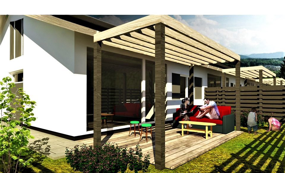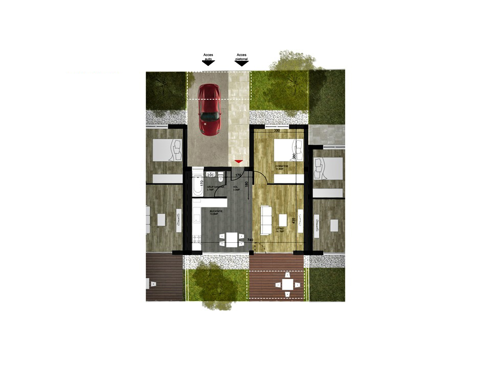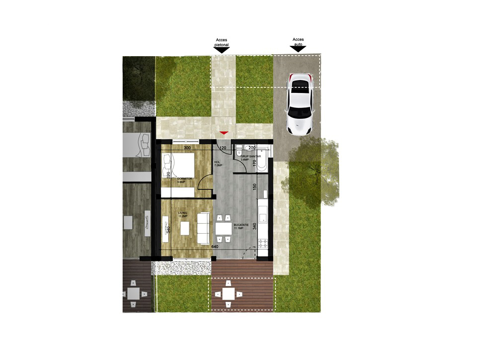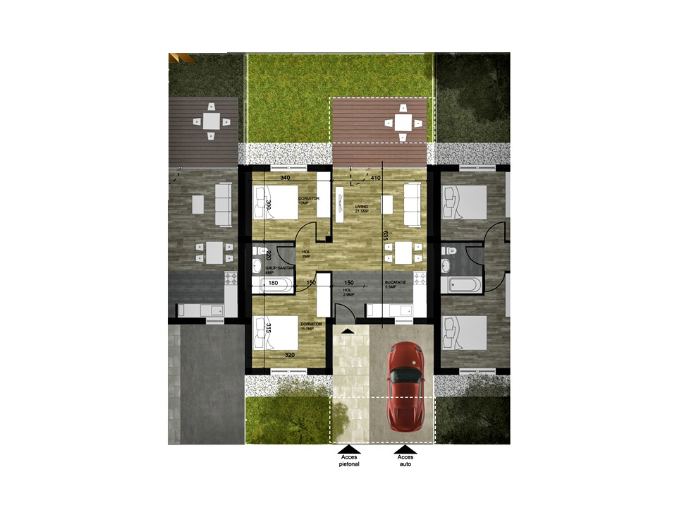 Curtea și spațiul de relaxare sunt poziționate în spatele casei, pentru mai multă intimitate și liniște, exact cum trebuie pentru confortul unei familii.