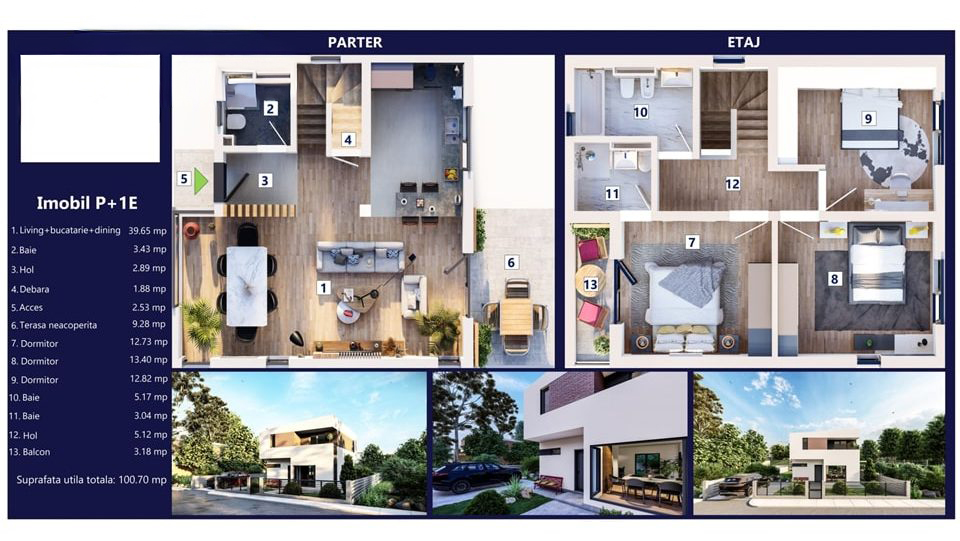 Casa este compartimentată astfel: 3 dormitoare, living spațios, bucătărie semi-deschisă, 3 băi, terasă și balcon.